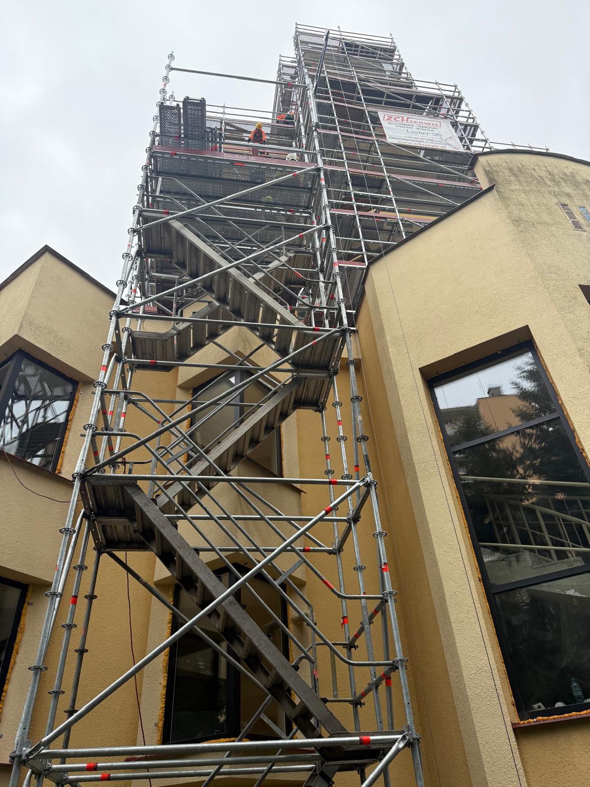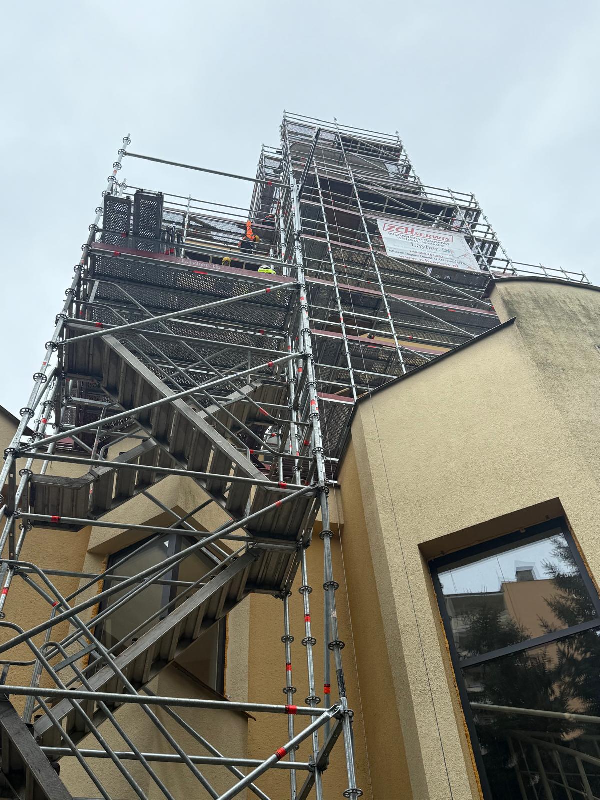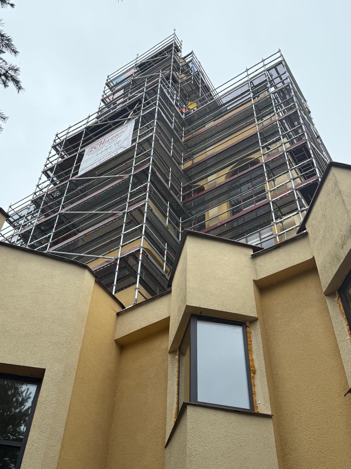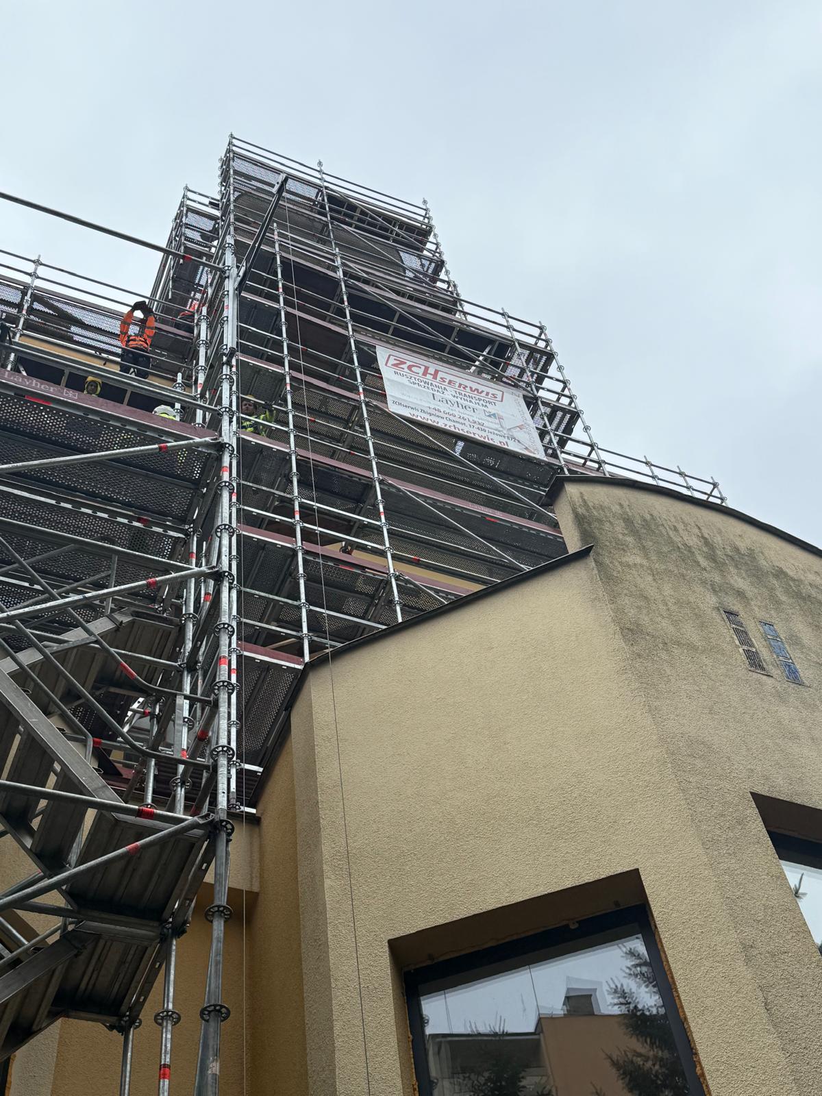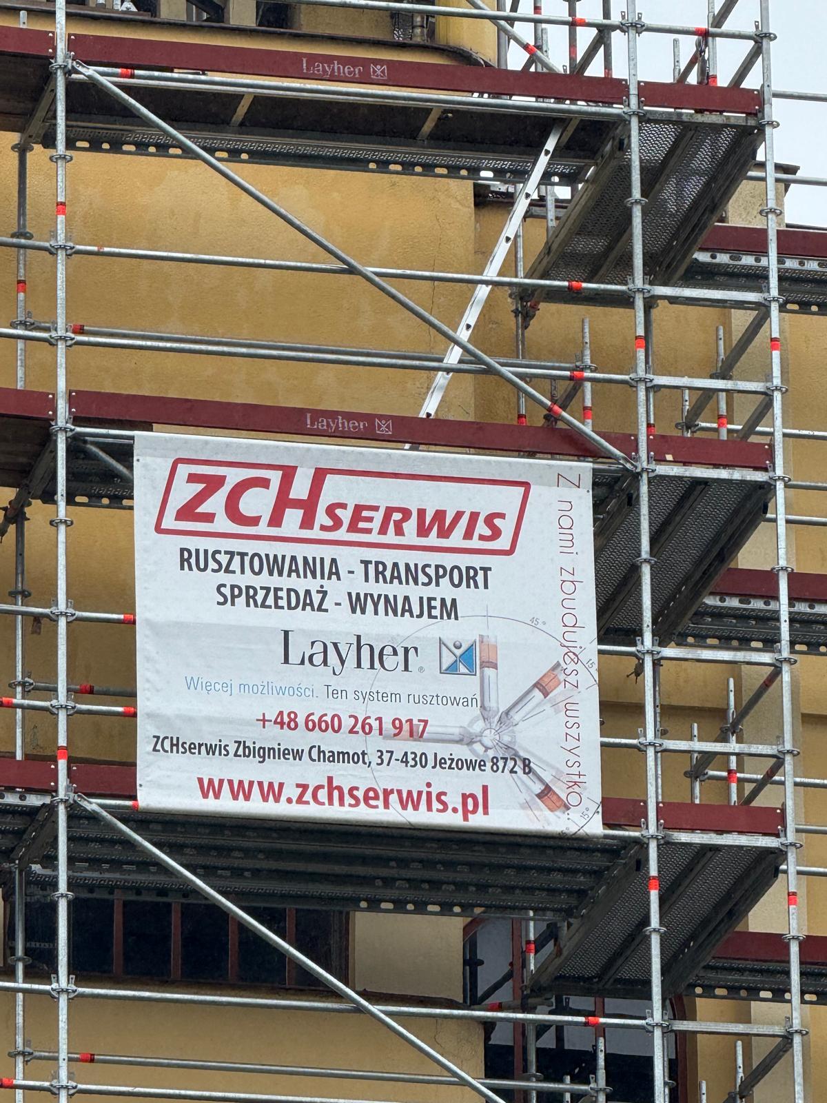 W ramach realizowanego zadania, firma ZCH Serwis odpowiadała za dostarczenie, montaż oraz demontaż specjalistycznych rusztowań systemowych Layher. Rusztowania te umożliwiły bezpieczne prowadzenie prac renowacyjnych elewacji oraz detali architektonicznych obiektu, zapewniając jednocześnie komfort pracy ekip konserwatorskich i najwyższe standardy bezpieczeństwa.